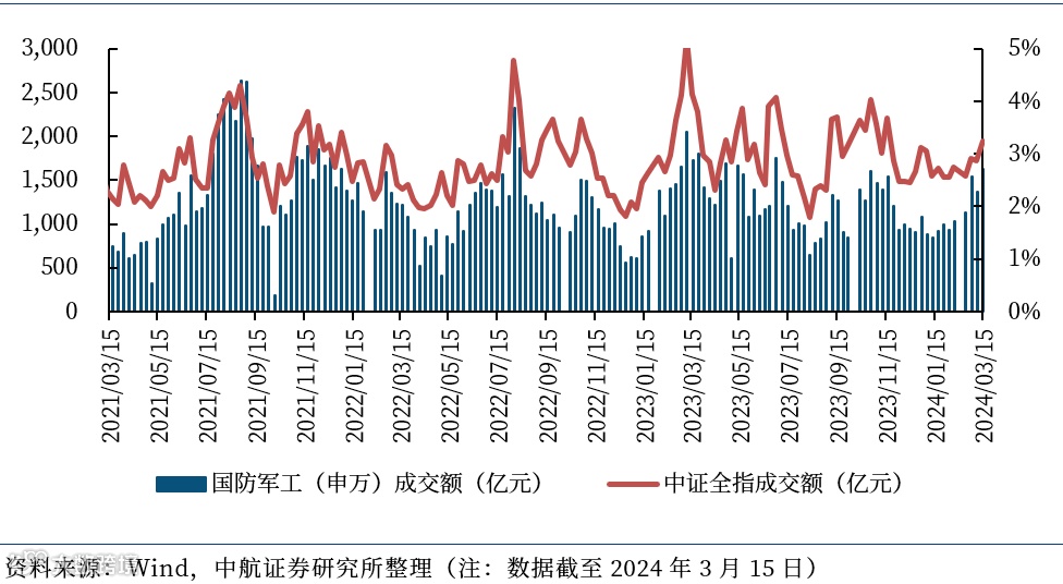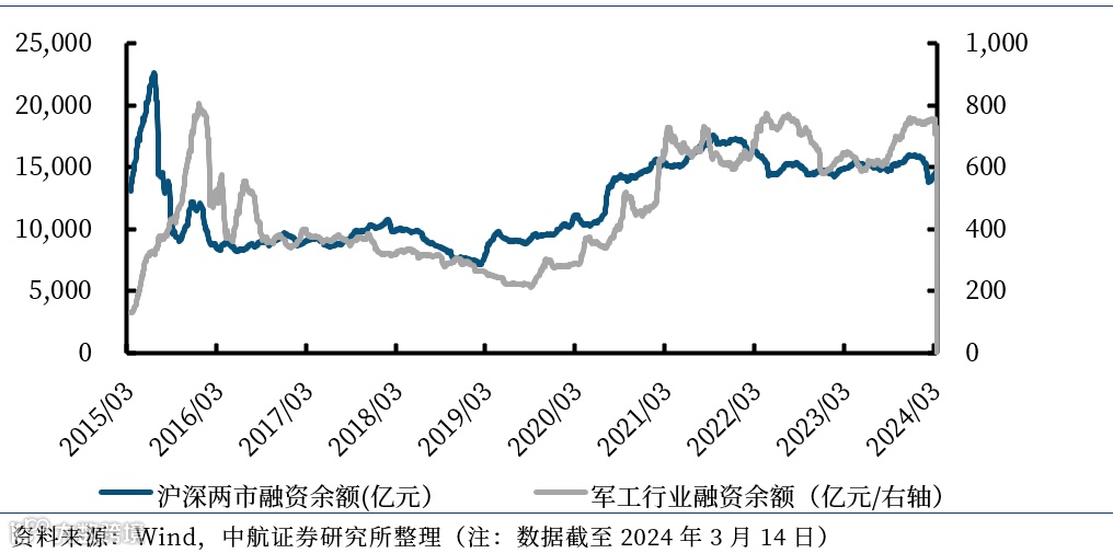 截至2024年3月14日,军工行业的融资余额合计726.53亿元,比上周环比下降0.28%,占两市融资余额比例为4.93%。