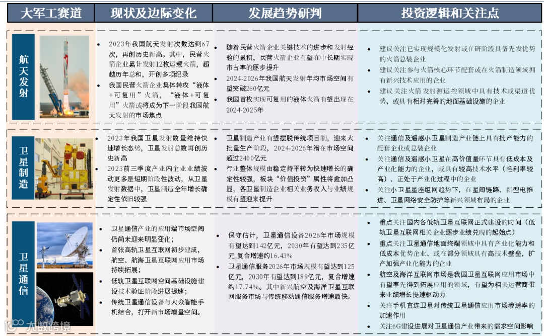 ② 大军工赛道:主要包含以军贸、民机、低空经济、航天发射、卫星制造、卫星通信、卫星导航、卫星遥感、民船以及信创等十个“大军工”产业细分领域。所谓“大军工”,是指当前军工行业的范畴已大为拓展,特别是军技民用下广义概念下扩充的军工新赛道。这些领域或已具有一定规模或仍在快速发展阶段,是支撑军工行业持续高景气发展的第二曲线。