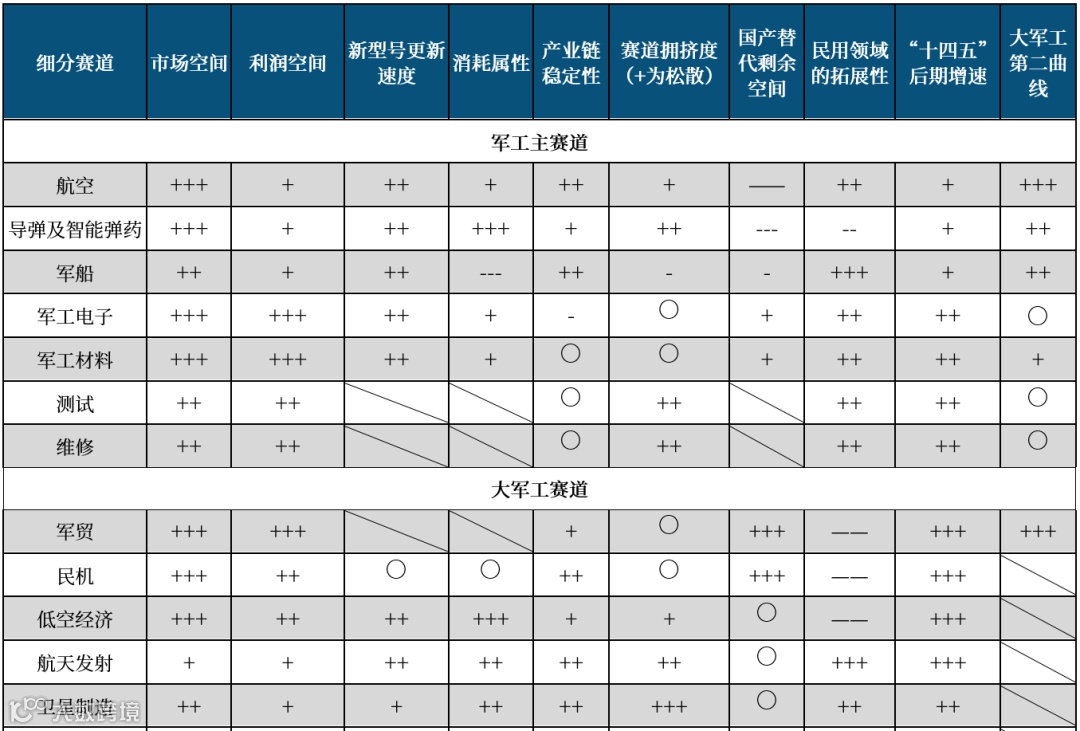 ① 军工主赛道:主要包含航空、导弹及智能弹药、军用船舶、军工电子、军工材料、测试及维修等七大细分领域,这些领域一般具有市场规模相对较大,下游客户已军用领域为主,且发展相对更为成熟的特点,是军工行业当前的主要构成及发展驱动力。