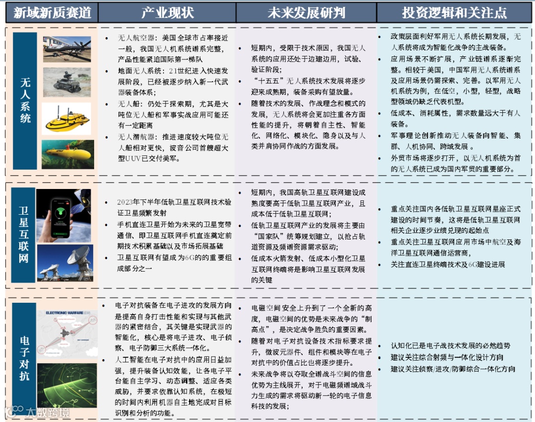 ③ 关注无人装备、卫星互联网、电子对抗等新质新域的投资机会;