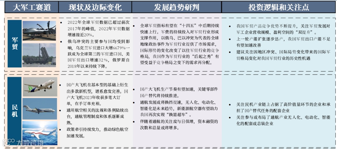 ④ 关注民机、低空经济、军贸、信息安全、商业航天等军民结合领域的“大军工”投资机会;