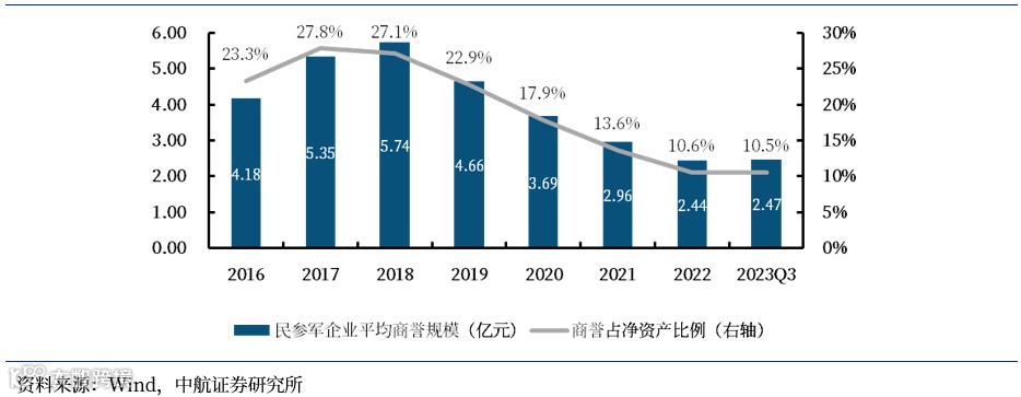 2015年前后,民参军企业迎来一波并购潮,但寻求业务转型与增厚业绩、捕捉市场热点与提升估值水平,曾是部分民营上市公司并购军工企业的主要动机,并购后形成的大量商誉也增加了公司的风险。后来随着承诺期后业绩下滑、并购整合不及预期等风险暴露,很多公司面临了商誉减值的风险。