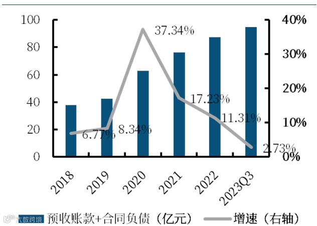 短期需求不足,合同负债、存货降速。资产负债端来看,民参军上市企业2023年前三季度合计存货680.91亿元(同比+12.12%),可以看到民参军企业的库存增速从2021年不断下降,主要是行业短期需求不足导致的备货不足。预收账款+合同负债合计94.98亿元(同比+2.73%),由于需求不足,新合同订单签订放缓,增速同样出现下降。