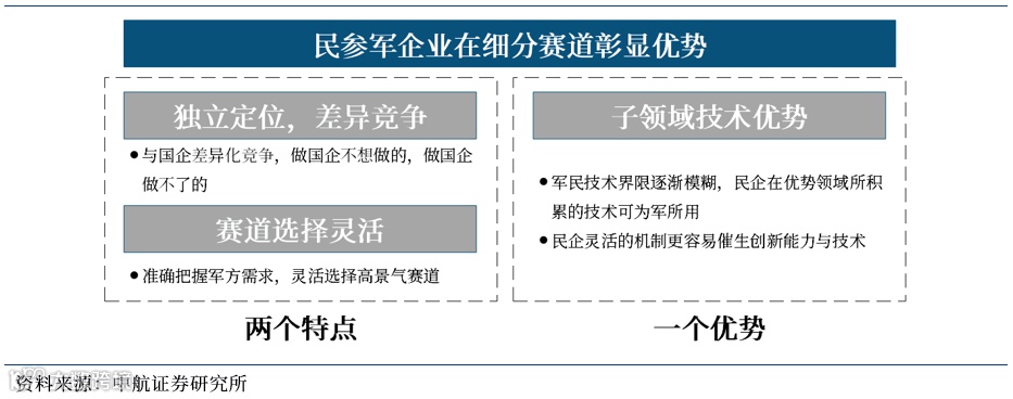 民参军企业具有技术与机制优势。民企参与军品市场,具备两大优势:一是军民技术界限逐渐模糊,民企在优势领域所积累的技术可为军所用,如计算机、半导体、电子、通信及制造技术的发展,已主要由民用市场所推动,民营企业在这些领域已经取得了不凡的成绩。二是民企灵活的机制更容易催生创新能力与技术。民营企业往往拥有标新立异的设计思想、“异想天开”的创新理念、另辟蹊径的技术路线、独具匠心的工艺诀窍、独一无二的优质产品,甚至产品达到国际领先水平,在部分领域,民营企业甚至可填补军方技术上的空白。
