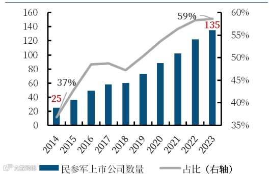 从上市公司数量来看,民参军上市公司由2014年的25家上升至2023年的135家,在军工行业中的占比由37%上升至59%,超过了军工上市公司的一半;