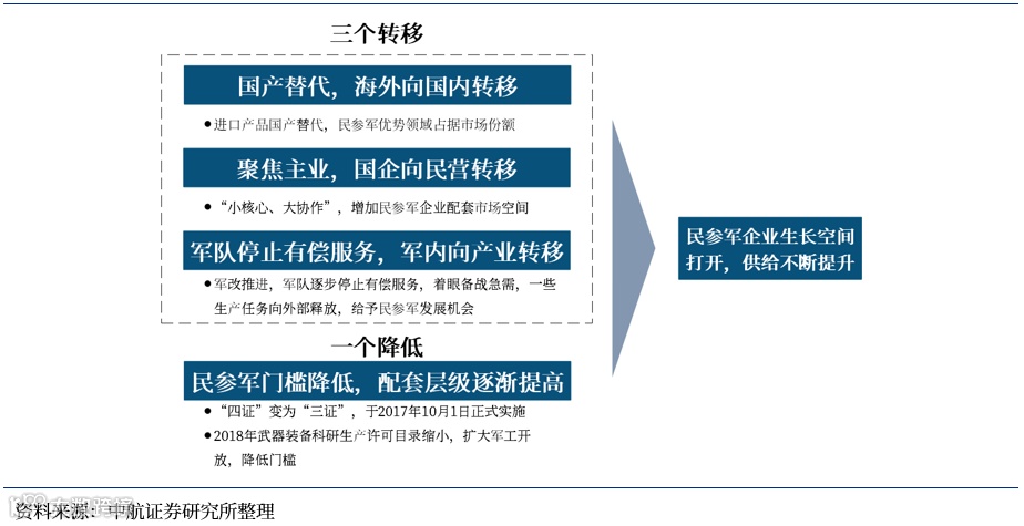 ③军队停止有偿服务,军内向产业转移,给予民参军企业发展机会。随着军改的推进,军队逐步停止有偿服务,一些军队体制下的科研院所、高校科研机构着眼备战急需,着力开展基础前沿创新和关键核心技术研究,致使一些生产任务委外给产业;