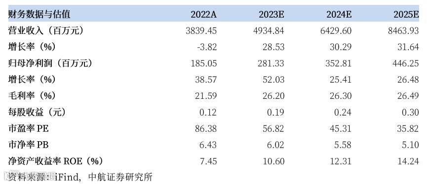 基于以上观点,我们预计公司2023-2025年的营业收入分别为49.35亿元、64.30亿元和84.64亿元,归母净利润分别为2.81亿元、3.53亿元和4.46亿元,EPS分别为0.19元、0.24元、0.30元。基于公司所处行业地位以及未来的发展前景,我们维持“买入”评级,目标价12.80元,对应2023-2025年预测收益的67倍、53倍及43倍PE。