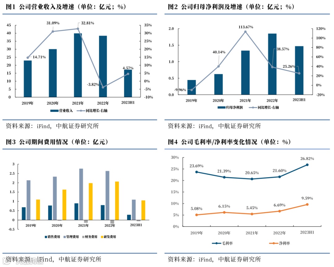 报告期内,公司母公司实现营业收入(13.36亿元,+9.93%,2019H1-2023H1复合增速+65.05%),净利润(1.57亿元,+35.12%,2019H1-2023H1复合增速+101.90%),公司母公司军民两用产品业务持续提升,印证了我们在过往点评报告中,对公司业绩持续看好的观点。