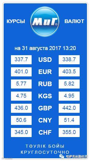 【обменный курс】2017年8月31日哈萨克斯坦坚戈汇率