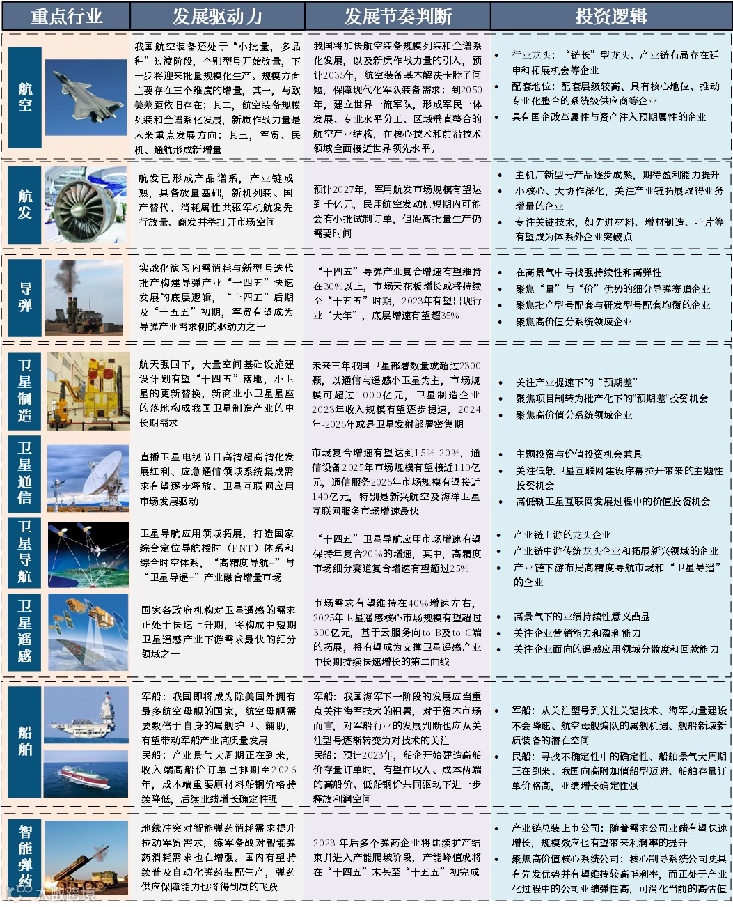 军工细分产业主要包含了航空(军机)、航空发动机、导弹、卫星产业(卫星制造、卫星通信应用、卫星导航应用以及卫星遥感应用)、船舶以及陆装(智能弹药)等海陆空天军工细分装备,合力推动了“十四五”军工板块高景气发展。