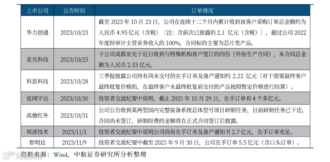 1、10月下旬以来,部分公司披露订单进展或在手订单情况,出现了提速迹象,如智明达、亚光科技、高德红外、亚光科技等。