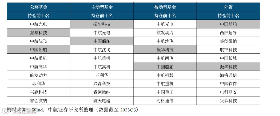 表5 公募基金及外资军工持仓前十名(灰底色为共同持有)