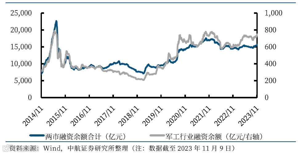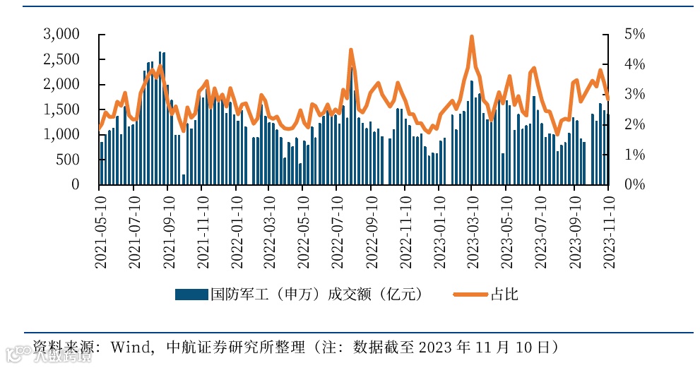 截至2023年11月9日,军工行业的融资余额合计745.99亿元,较上周五增长1.11%,占两市融资余额比例为4.75%(较上周五减少0.02),目前来看,军工行业融资余额仍旧处于较高水平,可能会造成军工板块走势波动。