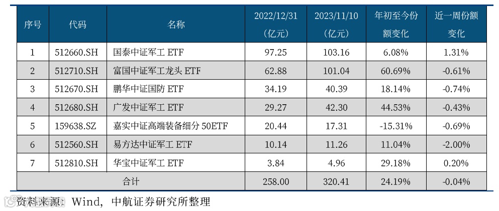 本周,军工板块(申万)成交额为1394.85(-5.21%),军工板块(申万)占Wind全A成交额的比重为2.85%(-0.53pcts)。主要军工ETF基金份额减少0.04%(2023年年初至今提升24.19%)。