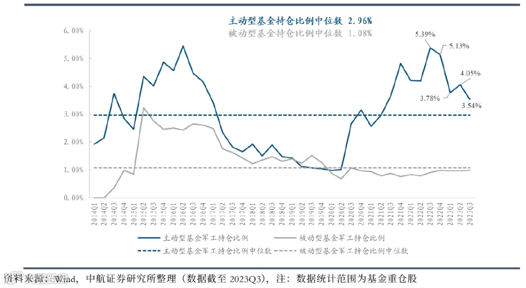 图3 2023Q3主动型、被动型基金军工持仓比例环比下降