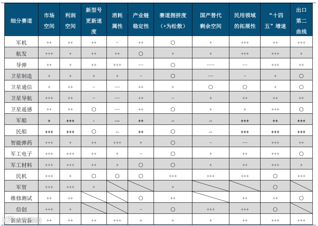 在军工十六大赛道的研究与理解基础上,我们将不同赛道的发展特点进行了梳理(如下表所示),以供投资参考。