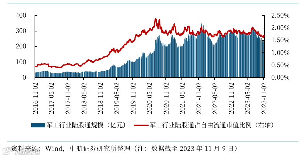 本周,北上资金累计净流出79.53亿元。军工行业陆股通占自由流通市值比例为1.69%,较11月3日环比下降0.05个百分点。