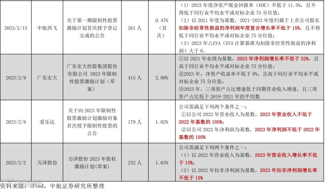 另外,2023年以来,隆达股份、西测测试、神宇股份以及金信诺等20家军工板块上市公司密集推出股权激励计划,而从多数上市公司股权激励方案中披露的限制性股票解除限售条件中,我们统计发现,多数公司的2023年公司层面业绩考核要求中,收入或净利润端均呈现出相较于2022年的同比快速增长,一定程度上也反映出了军工上市公司自身对于2023年需求侧依旧维持高景气增长,对自身公司发展的信心同样维持在较高水平。