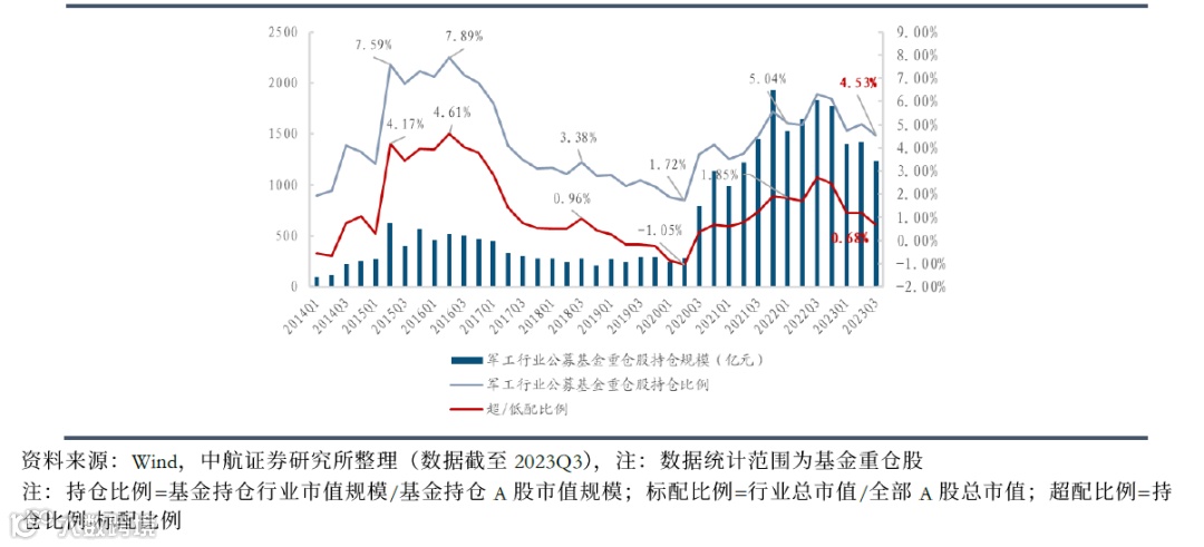 前期,市场对业绩增速的放缓已经有一定的预期。从资金层面,以公募基金为例,2023Q3公募基金军工持仓(重仓股)比例为4.53%,环比下降0.49pcts,持仓比例持续下降(2022Q3为6.31%),主动型基金军工持仓比例自2022Q3达到相对高点后出现持续下降,已由2022Q3的5.39%降至当前的3.54%,但同时被动型基金出现缓慢增长的趋势。