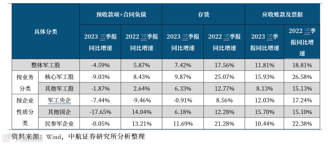 ① 2023Q1-Q3军工企业收入出现放缓、归母净利润增速中位数为负。对核心军工股进行统计,2023 Q1-Q3收入同比增速中位数由2022 Q1-Q3的21.28%下降至5.33%、净利润增速中位数由19.45%下降至6.65%;