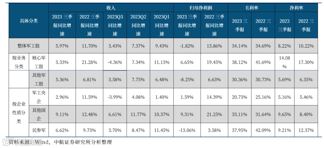③ 军工央企在归母净利润增长稳定性上优于民参军企业。军工央企2023Q1-Q3收入增速(+2.96%)虽低于民参军企业(+6.62%),但归母净利润增速(+1.59%)仍保持了正向稳定增长;