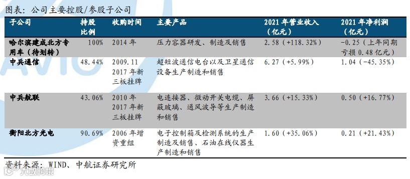 公司主要控股、参股子公司四家:哈尔滨建成(持股比例100%)、衡阳北方光电(90.69%)、中兵通信(48.44%)、中兵航联(43.06%)。哈尔滨建成北方专用车(公司持股100%)实现营业收入2.58亿元(+118.32%),净利润-2524.94万元(上年同期亏损4799.21万元,亏损收窄),军品方面主要依托航弹院的军品配套任务,民品方面面对市场下滑的不利因素,开拓市场争取产品订单,积极减亏。公司2022年3月18日第一次临时股东大会决议将哈尔滨北方专用车100%股权分别转让给中国兵器工业集团航弹院和导航集团持有,进一步聚焦主业,提升盈利能力。