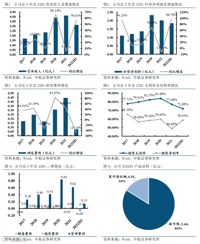 需求增加产能释放,净利率大幅提升:受益于公司产能释放、以及下游客户需求量的增加,2022H1公司碳纤维及织物实现总产量138.71吨(+150%),发货量130.98吨(+72%),促进公司业绩维持高速增长(营收+56.63%,归母净利润+96.70%),其中碳纤维营收2.64亿元(+69.23%),毛利率72.26%(-5.96pcts);碳纤维织物营收0.51亿元(+13.02%),毛利率69.87%(-11.41pcts)。公司2022H1毛利率(71.88%,-7.03pcts)有所下降,主要是千吨线投产后,相关折旧由管理费用转移到成本所致。而随着千吨线的稳定生产,费用率的下降,2022H1净利率出现大幅增长(58.61%,+11.94pcts)。单看22Q2,公司实现收入1.42亿元(同比+11.22%,环比-17.67%),归母净利润0.94亿元(同比+51.76%,环比+3.65%),Q2公司毛利率(75.07%,环比+5.82pcts)、净利率(66.06%,环比+13.59pcts)的提升,促使了公司Q2营收环比下降的情况下,净利润环比小幅增长。