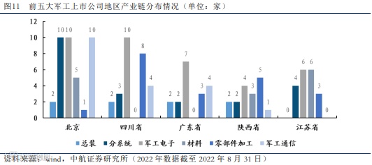 不同地区军工企业具有独特的产业特点。前五大军工企业所处区域中,北京在分系统、军工电子和军工通信产业链拥有较多上市公司,零部件加工类公司较少;四川省和陕西省需要配套相关主机厂,因此具有较多的零部件加工类公司;广东省以军工电子类企业突出;江苏省在配套方面具有优势,因此在军工材料、零部件加工等环节拥有较多上市公司。不同地区拥有其在国防军工领域较为侧重的产业链环节,形成其独特的优势。