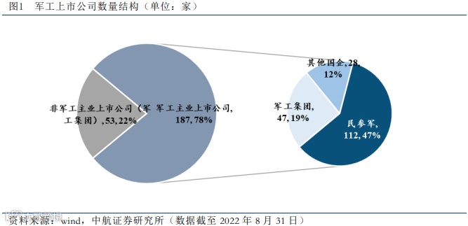 广义的军工上市公司(数量240家)包含了53家军工集团下属非军工主业公司,本文讨论分析的军工上市公司主要为军工主业上市公司(187家),其中军工集团军工上市公司47家,其他国企类军工上市公司28家,民参军上市公司112家。