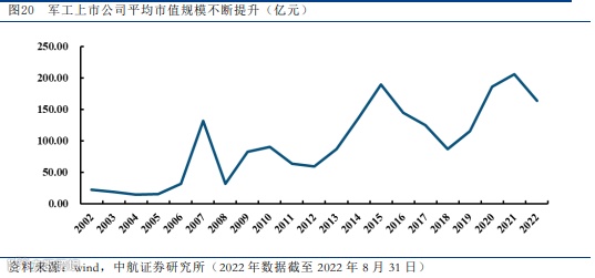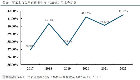 虽然目前军工上市公司大部分市值仍然偏小,但可以看到2017年以来,军工上市公司市值集中度(CR10%)呈增长趋势,由2017年的36.92%增加到2022年(截至8月31日)的41.50%,即10%数量的公司占市值的40%以上,头部公司的市值占比提升。而从这些军工上市公司平均市值规模来看,随着越来越多优质军工企业不断上市、军工行业景气度的不断提升以及市场关注度的增加,军工行业市值重心不断上移。