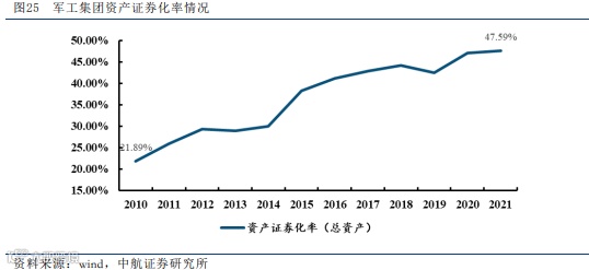 军工集团资产证券化加速。随着注册制正式实行以及改革政策的推动,军工集团资产上市明显加速。目前我国军工集团资产证券化率较以往得到了大幅提升,从2010年的21.89%到2021年已提升至47.59%,但从全球来看,国外军工企业资产证券化率为70%到80%,国内的军工资产证券化仍然属于较低水平,大幅低于国外成熟军工企业。