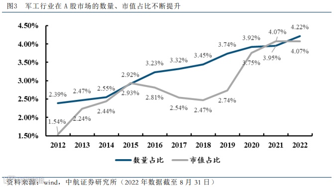 随着军工上市公司数量的不断增加,军工上市公司的总市值不断提升,从2012年的3523亿元(占A股上市公司总市值的比例为1.54%),到目前(2022年8月31日)的3.07万亿元(占A股上市公司总市值的比例为4.07%),十年来军工上市公司市值增加了近8倍。