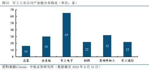 从军工上市公司产业链分布来看,可以分为总装、分系统、军工电子、材料、零部件加工和军工通信六大类,其中军工电子拥有65家上市公司,以35%的占比位于首位,总装类军工上市公司数量最少,仅有16家,占比9%。