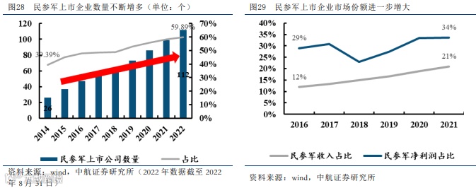 随着自主可控、国产替代的推进,“小核心、大协作”体系的确立,以及民参军的门槛降低,民参军企业市场空间显著增加,配套层级不断提升,成长天花板大幅抬升。上市企业数量由2016年的26家上升至目前的112家,占比由39%上升至60%。市场份额占比也进一步扩大。