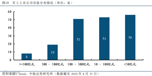 从军工上市公司市值分布来看,截至2022年8月31日,千亿市值以上的公司仅有4家,分别是紫光国微(1325亿)、航发动力(1225亿)、中航沈飞(1152亿)、中国船舶(1120亿)。500亿以上的大市值公司目前占比只有4%,100亿元以下市值的军工上市公司占比超一半,为58%。