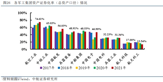 从各集团来看,航空工业近几年资产证券化推进进程明显,2021年航空工业A股上市公司资产证券化率达到最高的74.61%,无论在证券化规模还是证券化率方面都是各集团的表率;其次是中核集团以及中国航发资产证券化率能够维持在50%以上;兵器装备、中国船舶、中国电子、中国电科以及兵器工业资产证券率在30%-50%区间;证券化率较低的主要是航天科工和航天科技集团,A股上市公司资产证券化率均在20%以下。