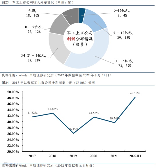 军工行业涉及行业多,产业链广,而在目前配套企业偏多,下游总装或系统级企业整体偏少的情况下,收入、净利润规模较小的军工上市公司仍然占大多比例,有待进一步发展提升。但可以看到,军工行业上市公司收入、净利润的头部集中情况明显,10%的公司业绩规模全行业占比近一半。我们认为随着军工行业景气度的不断提升,军工市场规模的稳步扩大,在企业的上下游拓展,及充分竞争后,军工行业内的马太效应将会进一步体现。