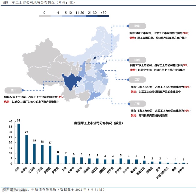 1、首都北京依托军工集团总部、科研院所以及军方客户的地域集中优势,以38家(占比20%)上市公司的数量遥遥领先;