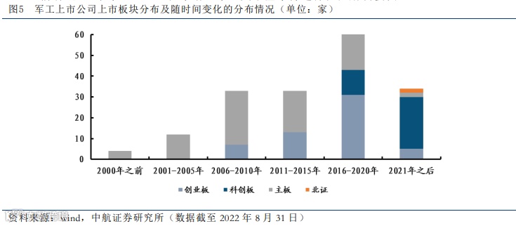 借着军工行业快速发展的东风,愈来愈多的军工公司达到独立上市条件,军工上市公司数量从2012年的59家上市公司(占A股上市公司数量比例为2.39%),到目前(2022年8月31日)的187家上市公司(占A股上市公司数量比例为4.22%),十年来军工上市公司数量增加了3倍。仅2021年以来,就有新增军工上市公司33家,近三年平均每年新增公司数量为16家,并且有加速趋势,假设未来几年每年增加16家,预计到2025年,军工上市公司数量有望达到240家左右,届时军工行业的影响力将进一步提升。