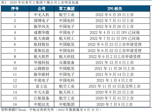 随着注册制正式实行以及改革政策的推动,军工集团资产上市明显加速,2020年以来共有10家军工集团上市公司IPO上市,1公司转板北交所,同时还有5家正在办理上市。