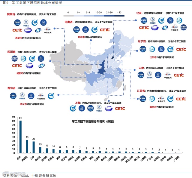 军工上市公司围绕军工集团下属院所、主机厂进行地域集群分布。据统计,十大军工集团共有约259家科研院所,分布在25个省份、55个城市。