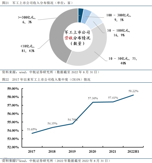 从军工上市公司收入(2021年)分布来看,收入在300亿元以上的公司共有6家,分别是中国船舶、中国重工、楚江新材、航发动力、中航沈飞以及中航西飞,大部分为主机厂。军工上市公司收入主要集中在10亿元以下,占比为43%。2017年以来,军工上市公司收入集中度(CR10%)不断增长,由2017年的53.65%增加到2022H1的58.22%,10%数量的公司收入规模占比近60%。