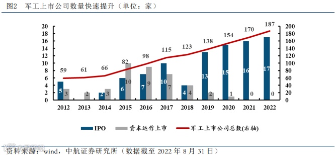 军工资产证券化加速,2025年有望达到240家左右。军工上市公司数量从2012年的59家上市公司到目前的187家上市公司,十年来军工上市公司数量增加了2倍。仅2021年以来,就有新增军工上市公司33家,预计到2025年,军工上市公司数量有望达到240家左右,届时军工行业的影响力将进一步提升。