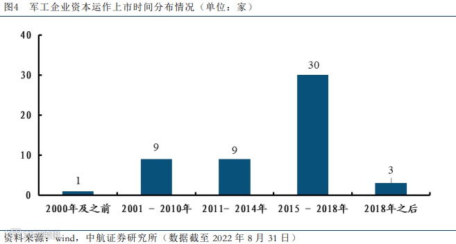 军工资产上市主要有两个路径,一个是直接IPO上市,另一个是通过资本运作上市(如重组、注入、并购军工资产等方式)。在目前上市的军工企业中,有52家公司是通过资本运作的方式实现军工资产上市,从时间分布来看,主要集中2015-2018年,数量占比达到一半以上(30家,占比58%)。2019年随着科创板的建立以及注册制的推行,军工企业上市门槛降低,军工资产通过资本运作上市的数量明显减少,而直接IPO上市的企业快速增加。
