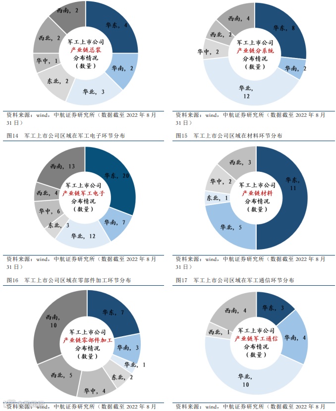 按照产业链环节在不同区域的侧重方向来看,总装、材料和军工电子相关环节均在华东具有明显优势,相关军工上市公司数量分别为4家、11家和20家;分系统和军工通信环节在华北拥有最多的相关军工上市公司,分别12家和10家;而零部件加工环节则在西南地区占据领先地位,拥有10家相关军工上市公司。