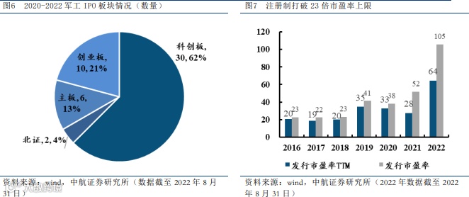 注册制打破23倍发行市盈率上限,为优质军工企业提供更多资金。注册制对于军工企业的定价更加合理,对于优质的企业,估值的提高可以给予公司更多的募集资金。可以看到2019年以来军工企业的上市市盈率不断提高,到2022年(截至8月31日)军工上市公司的平均发行市盈率已经超百倍,平均发行市盈率(TTM)也达到了64倍。注册制以来,所有注册制上市A股平均发行市盈率为49倍,平均发行市盈率(TTM)为29倍,军工上市公司则分别为70倍、46倍。