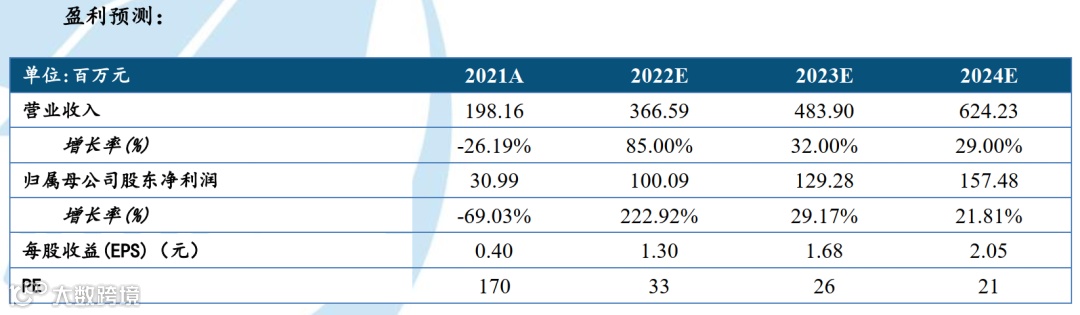 我们预测公司2022-2024年的营业收入分别为3.67/4.84/6.24亿元,归母净利润分别为1/1.29/1.57亿元,对应EPS为1.3/1.68/2.05,PE为33/26/21倍。给予“买入”评级,建议持续关注。