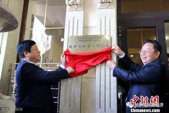 4月25日,哈萨克斯坦华商总会在阿拉木图宣布成立。图为,中国驻哈萨克斯坦大使张汉晖(左)与首届会长罗格(右)为商会揭牌。 文龙杰 摄