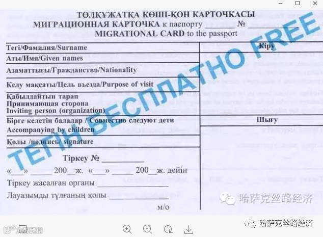 3、办理移民卡程序为了规范对外国公民来哈及在哈居留的管理工作,根据2003年3月13日哈萨克斯坦共和国政府第241号决议<关于加强移民管理的几点措施>,哈方将于2003年6月1日起,在国际机场、阿克套海港、移民警察局,2003年7月1日起在哈各边防检查站发放移民卡。哈国家安全委员会边防局的官员负责在各大边防检查站发放移民卡申请表;不设边检站的地点,由海关官员代为发放。年满16岁的外国公民进入哈境时,需填写移民卡申请表,在哈居留期间持有移民卡;离境时将移民卡交回边防检查站或海关。