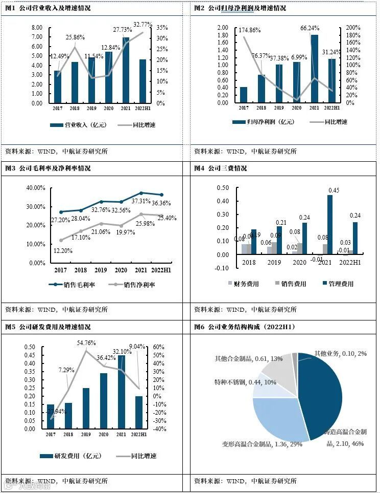 变形高温合金制品主要应用于燃气轮机、石油化工领域,部分用于飞机、航空发动机领域。变形高温合金制品及制品,收入(1.36亿元,+46.24%),毛利率(30.91%,+0.13pcts)。收入占比29.50%,毛利占比25.77%。